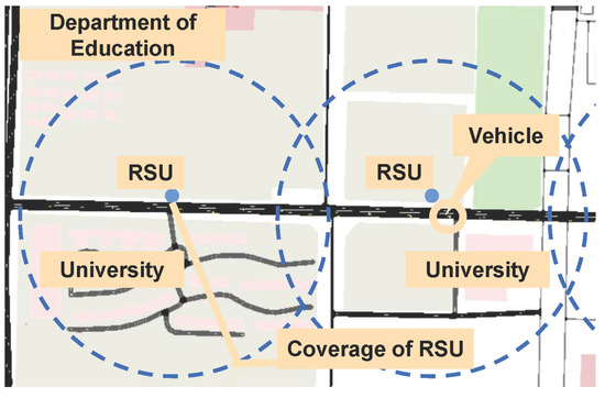 In this section, we our experiments based on realistic and simulated vehicle trajectories. Considering a realistic scenario of the Yanta area in Xi’an, China, we verify our experiments based on the GAIA Open Dataset containing mobility traces from DiDi Express [19]. We select a one-way two-lane road with a length of 1000 m. The dataset includes GPS data for Xi’an city collected over a 30 day time range from 1 November 2016 to 30 November 2016. Each trajectory consists of a vehicle ID, timestamp, longitude, and latitude. After preprocessing the raw data, the vehicle trajectories of 50–90 vehicles are extracted. We take the average value from ten experiments as the experimental result. Additionally, we carry out simulation experiments with different traffic congestion levels. We use OpenStreetMap [20] to import the Xi’an map into SUMO and generate vehicle trajectory data, as shown in Figure 4. The two RSUs are located at the roadside and their coverage is overlapped. There are N vehicles with different speeds on the road. The simulation parameters with RSU1 are shown in Table 1, and RSU2 is similar. For the simulation environment, we use a GPU-based server with an Intel Core i5-9400F CPU with 16 GB memory. The software environment is Python 3.7 on Ubuntu18.04 LTS.