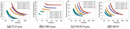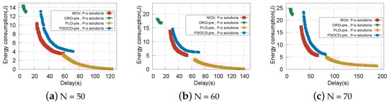 Next, we clearly describe Pareto-optimal solutions of the four schemes with different numbers of vehicles, as shown in Figure 6. It can be seen that ORO-pre (the ORO algorithm with vehicle prejudgment) has a higher energy consumption and a lower delay, while PLO-pre (the PLO algorithm with vehicle prejudgment) has a higher delay and a lower energy consumption. The reason for this is that if all tasks are offloaded, more RSUs resources are allocated to transmit and process tasks, which increases energy consumption due to resource utilization. However, if all tasks are processed locally, the delay is greatly increased. This is because vehicle computation capacity is limited to processing tasks. As for PSOCO-pre and MOV, the two indexes are between those of ORO-pre and PLO-pre, and our proposed MOV has better performance than PSOCO-pre. This is because we specifically consider the offloading decision-making at the coverage boundary of the two RSUs, in which RSE cooperates to complete tasks that avoid service interruption and the imbalance of RSU load. However, for PSOCO-pre, only the nearest RSU is mentioned, in order to prevent the vehicle driving out the RSU during task transmission, meaning that more data is processed locally, resulting in more delay.