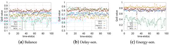 The unstable communication condition of each time slot is a key challenge during the task offloading. Figure 7 shows the performance comparison of the QoS value on 100 slots with unstable link bandwidths. Our MOV algorithm achieves better performance compared with other algorithms under three average QoS weights : “Balanced”( = 0.5, = 0.5), “Delay-sensitive”( = 0.8, = 0.2), and “Energy-sensitive”( = 0.2, = 0.8). It can be seen that: (1) MOV achieves a consistently high QoS value and the highest QoS for “Balance”, as it can use a better offloading strategy considering different task requirements through cooperation and the real-time speeds related to tolerance delay. PSOCO shows a smaller QoS value than MOV, as it only considers the nearest RSU to offload tasks without cooperation of RSUs, resulting in a suboptimal strategy. For PLO and ORO, the QoS values are the lowest because the cooperation between vehicles and edges is ignored. (2) In Figure 7b,c, compared to the ORO, PLO, and PSOCO algorithms, the MOV algorithm shows better QoS performance. Although ORO achieves the highest QoS value for “Delay-sen”, its QoS value is the lowest, and it has a large fluctuation for “Energy-sen”. This is because, while ORO achieves the lowest delay, as mentioned above, because is very suitable for delay-sensitive tasks, for energy-sensitive tasks its QoS value is the lowest and fluctuates due to unstable network conditions. On the contrary, while PLO is suitable for “Energy-sen”, it is the worst for “Delay-sen”. This is because PLO achieves the lowest energy consumption, which results in the highest delay. Moreover, our algorithm MOV achieves the highest QoS value compared to PSOCO, especially for “Delay-sen”, because it considers the speed-related tolerance delay limit, which further reduces task completion delay. Therefore, MOV is always a better choice to satisfy the QoS requirements of any task.