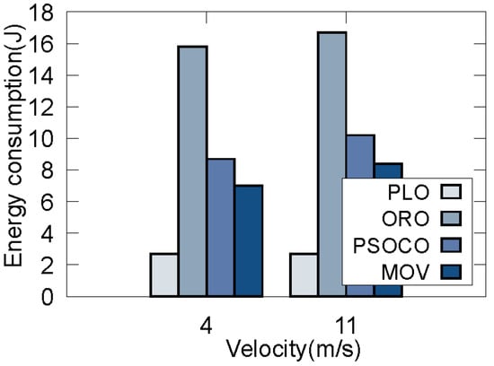 Considering that there may be traffic congestion on a real road, in this scenario the speed of the vehicles is low. Thus, when the number of vehicles with different demands at a certain time is 60, we compare the performance indicators of different traffic congestion conditions, with the average speed of all vehicles being 4 m/s and 11 m/s based on simulated data in Figure 8 and Figure 9. It can be seen that: (1) for MOV, there is a higher delay and lower energy consumption when the average speed is 4 m/s compared to when it is 11 m/s. The reason for this is that a higher velocity causes more offloading failures, and the vehicle drives out of the current RSU during offloading. Therefore, the vehicle tends to offload the task to RSUs with low delay when the vehicle speed is high, which leads to greater energy consumption during to task processing. (2) Compared with PSOCO, our method achieves lower delay and energy consumption at any speed, as PSOCO ignores task offloading failure due to the high mobility of the vehicle. As our method considers vehicle prejudgment in Step 1, each vehicle can make the optimal offloading decision. (3) While ORO achieves the lowest latency, it produces the largest energy consumption. On the contrary, while PLO achieves the lowest energy consumption, its delay is too high, independent of vehicle speed. As a result, our algorithm can achieve optimal performance, and is able to select the maximum QoS value relative to the speed of the vehicle.