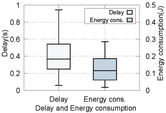 In order to show the performance of our MOV, an optimal offloading strategy is selected under the QoS model; in this scenario, the number of vehicles is 50. The delay and energy consumption of each vehicle are shown in Figure 10 with box plots. In Figure 10, most tasks can be finished in about 0.38 s and 0.12 J within maximum tolerance delay. This is because our method comprehensively considers cooperation between the RSUs and limits the possibility of task execution failure, which ensures the delay requirements for delay-sensitive tasks and avoids RSU overload or resource waste.