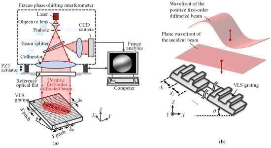 The feasibility of the proposed method is verified through experiments. Figure 10a,b show a schematic and a photograph of the experimental setup. The experiment was conducted in a room with careful temperature, humidity, and vibration control. A commercial Fizeau interferometer (VerifireTM, Zygo Corp., Middlefield, CT, USA) with a laser source having a wavelength of 632.8 nm was employed. The Fizeau interferometer was equipped with a reference flat in a diameter of 102 mm with an out-of-flatness of better than λ/20. It should be noted that the size of the reference flat directly determines the maximum measurement range of a VLS grating in a single measurement. The vertical resolution of the Fizeau interferometer was 0.05 nm. In the Fizeau interferometer, an image sensor having pixels of 480 × 640 was employed; the corresponding lateral resolution can be calculated to be 223 μm. The horizontal resolution governs the measurement interval of the wavefronts of the diffracted beams.