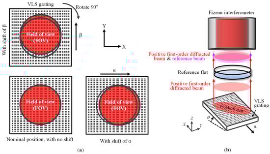 To address the issue, a new method integrating an interferometric pseudo-lateral-shearing method [34] into the conventional self-calibration method for the evaluation of a planar VLS grating is proposed. The concept of the proposed method is described in Figure 2a; the VLS grating is shifted in the orthogonal directions by a distance comparable to the lateral resolution of the Fizeau interferometer. Since only the grating is shifted while the interferometer is held stationary in the setup as shown in Figure 2b, the phase error induced by the out-of-flatness error of the reference flat in the Fizeau interferometer can be canceled out when taking the difference between the measured phase outputs before and after the shift.