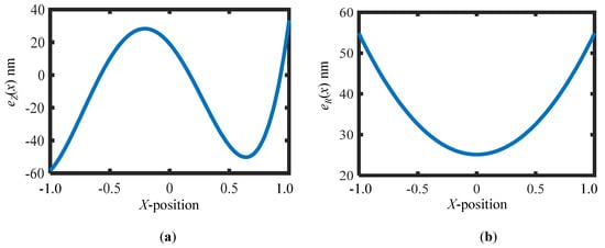 Figure 5a,b show the out-of-flatness of the VLS grating and the reference flat, respectively, assumed in the simulation. It should be noted that the X-coordinate x is normalized to be [−1, 1] from the range of [−60, 60], which corresponds to the simulation range of the VLS grating, for the sake of simplicity.