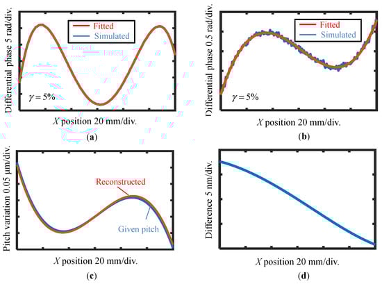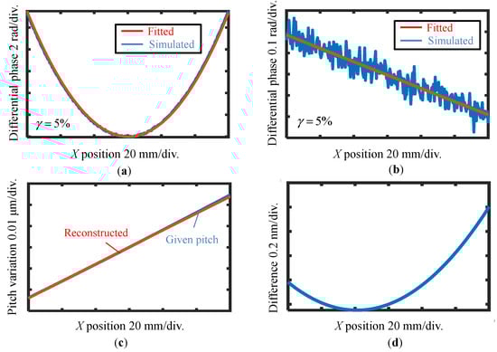 At first, the case in Figure 6a is simulated without applying the reference plane technique. Figure 8a shows the simulated differential phase output and its fitting result before the shift with a 5% noise level. The best third-order polynomial fitting result of the differential wavefront before the shift is shown in Figure 8a. Then, the best second-order polynomial fitting is applied to the differential wavefront before and after the shift, as shown in Figure 8b. At last, the VLS parameters are calculated according to the fitting results, and the reconstructed pitch variation is shown in Figure 8c, while the residual between the given pitch and the reconstructed one is shown in Figure 8d. From the analysis result, the retrieved parameters are found to be close to the original values even under the influence of noise components, which results in reconstruction errors of ∆b1 = 1.01 × 10−5 lines/mm2 (1%) and ∆b2 = 1.67 × 10−7 lines/mm3 (70%), respectively. From the results, it could be concluded that the estimation error of b1 is approximately 1% (∆b1/b1) while it is comparable to parameter b2. The amount of the error is mainly caused by the added random noise; in the actual measurement, the noise level is believed to be better than the 5% level. Through the simulation, it is verified that the proposed method can retrieve the relatively small VLS parameters.