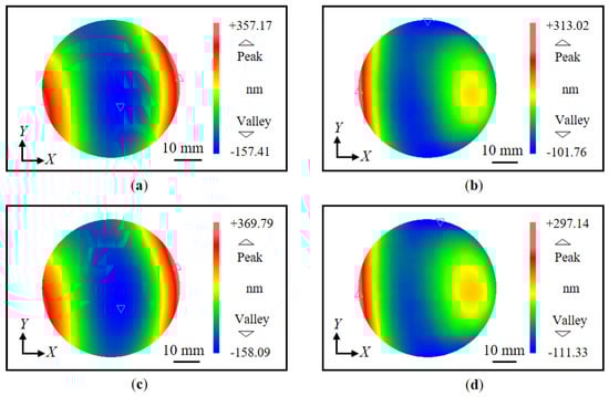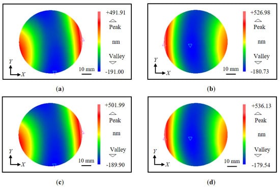 Figure 14. Measured diffracted wavefronts before and after shift (Y-direction): (a) Measured positive first-order diffracted wavefront before the shift; (b) Measured negative first-order diffracted wavefront before the shift; (c) Measured positive first-order diffracted wavefront after the shift; (d) Measured negative first-order diffracted wavefront after the shift.