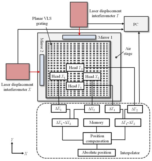 A comparative experiment was also conducted by recording the reading error of an absolute optical encoder [36], in which the calibrated VLS grating was employed as the scale. Figure 17 shows a schematic of the experimental setup. The absolute optical encoder consisted of the calibrated VLS grating, two optical heads, and an interpolator for the determination of the absolute location based on the readouts from the two optical heads. In the experimental setup, the VLS grating was placed on an XY air-bearing stage so that the optical heads could scan the grating surface in the X- and Y-directions. A measurement range was 100 mm along both the X- and Y-directions. The separation distance of the two reading heads was arranged to be 5 mm in the experiment. Two laser interferometers were also employed as a reference for the measurement of the stage displacement. At each stage displacement in a step of 1000 nm, corresponding to the central grating pitch, the readouts of the optical head and the laser interferometer were recorded. The comparison experiment was conducted in a room with temperature and humidity control. The temperature was controlled to be 23 ± 0.05°.