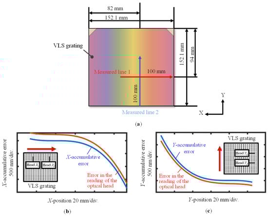 Figure 18. Measurement of the encoder errors of the absolute planar encoder and the comparison results: (a) Scanning lines along the VLS grating; (b) X-direction comparison result; (c) Y-direction comparison result.