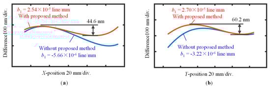 Figure 19. Differences between the encoder error of the absolute planar encoder and the accumulative results evaluated by using the assessed VLS parameter: (a) Differences between the comparison results along the X-direction with and without applying the proposed method; (b) Differences between the comparison results along the Y-direction with and without applying the proposed method.