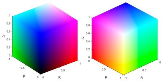Visualization of colour scheme for all combinations of the intensity of the polarization parameters. The colour channels represent the physical properties obtained through the polar decomposition. The left and right image show the same colour cube from different perspectives.