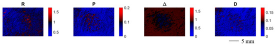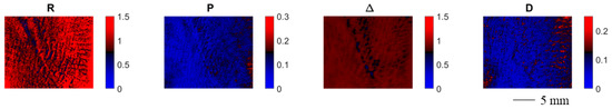 We visualize our results in such a way that they resemble dermoscopic images. Therefore, they can be intuitively interpreted by dermatologists. The agreement with the clinical practice could increase the acceptance by the dermatologists in addition. A visualization method of the polarimetric parameters derived from the Lu–Chipman decomposition is the polarization stain image (PSI). The PSI has been shown to help to identify locations of collagen, muscle fibers and connective tissue in skin tissue sections [32]. The method employed in this paper is based on the RGB colour space. The colour channels are filled with the spatially resolved polarization parameters according to Table 2.