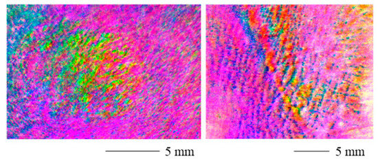 Figure 7 displays the threshold polarization stain images for a contracture scar (left) and a hypertrophic scar (right). The scarred skin can easily be identified. Near the margins of the image, the values change as for the range adjusted PSI. Again, the curved skin geometry could be the cause of this as the degree of polarization can be affected by the surface normal [36] and therefore also the surface roughness [37,38] of the skin. Therefore, results from complex skin topographies and roughness might be difficult to interpret. Additionally, the signal-to-noise ratio could increase near the edges of the field of view in the case of non-uniform illumination [39].