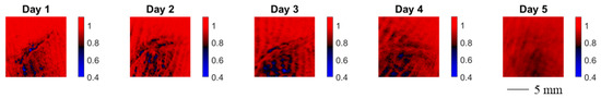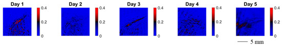 In the following, we study the wound healing process of an accidental cut in a finger with a knife. The healing process was documented by means of MMP on five consecutive days starting with the day after the injury. In Figure 8 we show the evolution of the spatially resolved depolarization power Δ. Note that the orientation of the wound in the image changes in between measurements.