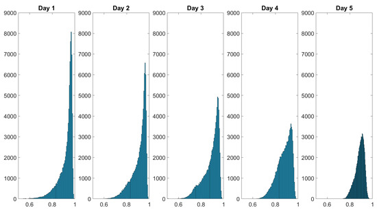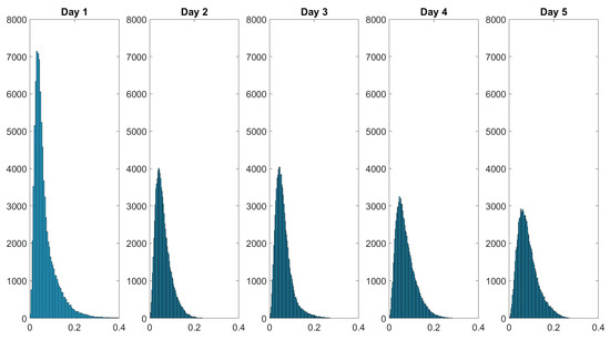 Over the course of the measurement period, the histograms of the spatially resolved depolarization power flatten while also displaying broadening. The initial negative skewed distribution changes throughout the course of the measurement period into a more bell-shaped distribution at day 5. Figure 11 shows the histogram of the diattenuation for the wound healing of a finger cut.