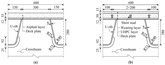 Orthotropic steel decks (OSDs) consist of flat steel plates stiffened by longitudinal ribs and transverse crossbeams, which have different stiffness characteristics in two perpendicular directions. Owing to its advantages of lightweight, high strength, convenient construction, and low life-cycle cost, the OSD has been extensively used in medium and large-span bridges all over the world [1,2]. However, OSDs are prone to fatigue cracking due to the complicated details and welds, which may affect the operation of bridges and even endanger the safety of bridges [3,4,5]. Furthermore, this phenomenon has become increasingly common and severe in conventional OSDs (COSDs) with the increase in vehicle loads and traffic volume, resulting in great economic losses and serious safety risks [6]. In recent years, various efforts have been made to improve the fatigue performance of OSDs. Thereinto, the lightweight composite OSD (LWCD), which is mainly composed of an OSD and an ultrahigh performance concrete (UHPC) layer, has been demonstrated to have a good performance in extending the fatigue life of the OSD [7] and is expected to be vigorously promoted and widely applied [8].