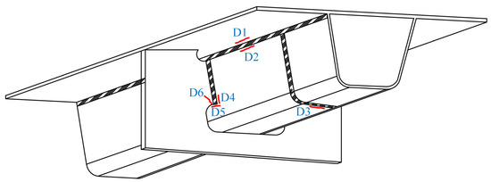 Many fatigue details in OSDs are prone to fatigue cracking due to the crisscrossing components and dense welds. More than 17 types of fatigue details have been found in steel bridge decks [6]. In this paper, six typical fatigue details identified in OSDs were considered, as shown in Figure 2, where D1 is the welded joint of rib-to-deck (RD) in deck plates, D2 is the welded joint of RD in ribs, D3 is the welded joint in the splice of ribs, D4 is the welded joint of rib-to-crossbeam (RC) in ribs, D5 is the end of the welded joint of RC in ribs, and D6 is the welded joint of RC in crossbeams. Note that the fatigue details D1, D2, and D3 in the LWCD were not investigated in this paper since their stress ranges induced by vehicle loads are below the corresponding cut-off limit, indicating that they have no risk of fatigue cracking under normal conditions [11,25].