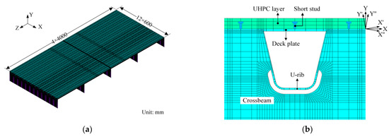 The global coordinate system in the present FEMs was defined as illustrated in Figure 3a. The X’-axis, Y’-axis, X’’-axis, and Y’’-axis in the local coordinate system, as shown in Figure 3b, were defined according to the angles of the webs on both sides of the U-rib. The translational degrees of freedom (DOFs) in the Z-axis and the rotational DOFs around the X-axis and Y-axis of all nodes at both ends of the present FEMs, except those of the end crossbeams, were constrained to model the role of continuous bridge decks. The translational DOFs in the X-axis and the rotational DOFs around the Y-axis and Z-axis of all nodes on the sides of the present FEMs were constrained to model the role of adjacent bridge decks. The translational DOFs in the Y-axis of the nodes at the bottom of all crossbeams were constrained to simulate the support of crossbeams. According to the Saint Venant principle, the stress response of fatigue details far away from the boundary of FEM would be hardly affected by those boundary constraints [30]. In the local FEM of the LWCD, the upper and bottom nodes of short studs were coupled with the corresponding nodes in the UHPC layer and the deck plate, respectively, ignoring the effect of nonlinear bonding between the UHPC layer and the short studs. The translational DOFs in the Y-axis of the nodes at the contact surface between the UHPC layer and the deck plate were coupled, ignoring the effect of bond-slip and push-out between them. Furthermore, the nonlinearity of materials was not considered in this paper as the stress of components in OSDs induced by vehicle loads generally remains linear-elastic [7]. It should be noted that these finite element modeling strategies used in this paper have been proven to be acceptable and effective to analyze the stress response of OSDs [24,31].