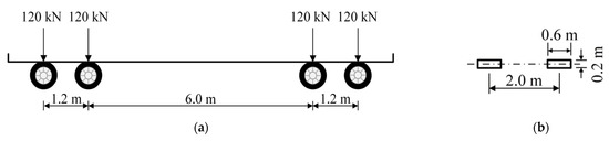 The fatigue load used in this paper was adopted from the Chinese specification for the design of highway steel bridges [32], namely, Fatigue Load Model (FLM) 3. As plotted in Figure 4, FLM 3 is a standard fatigue truck with a total weight of 480 kN evenly distributed on four standard axles. Furthermore, it was assumed that the roughness of the pavements in both the COSD and the LWCD is of good quality, thereby the dynamic amplification factor was set to be 1.2 [33].