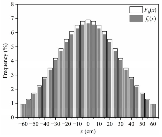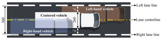 The clear width of a lane is 3.6 m and the width of the contour of FLM 3 is 2.6 m, as illustrated in Figure 5. When the standard fatigue truck travels within the lane, its maximum transverse offset is (360 − 260)/2 = 50 cm. Considering that the width of real trucks usually does not exceed 2.5 m and that human-driven vehicles may cross the lane line, the maximum offset of human-driven vehicles from the lane centerline was assumed to be 60 cm in this paper. For convenience, the vehicle center was taken as the reference point of the vehicle position and the lane centerline was set as the zero point of the transverse coordinate. In this way, all human-driven vehicles can be regarded to be distributed within a transverse range of (−60 cm, 60 cm). Then, the probability density function (PDF) of the transverse distribution of human-driven vehicles can be modified as [38]: