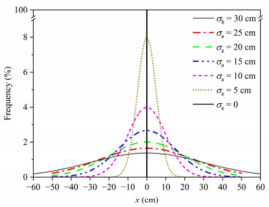 The current self-driving technology has been able to ensure that autonomous vehicles travel along the lane centerline with a deviation of less than 10 cm [38]. For the purpose of this study, μa was taken as 0 and five values for σa were considered, namely, 25 cm, 20 cm, 15 cm, 10 cm, 5 cm, and 0, wherein σa = 0 indicates that autonomous vehicles can maintain excellent stability to track the lane centerline without any offset. According to Equation (2), the modified PDFs of the transverse distribution of autonomous vehicles considering different standard deviations are illustrated in Figure 7, in which the modified PDF of the transverse distribution of human-driven vehicles (σh = 30 cm) was also plotted for comparison. As can be seen from Figure 7, the frequency of autonomous vehicles traveling along different transverse positions may be significantly different from that of human-driven vehicles.
