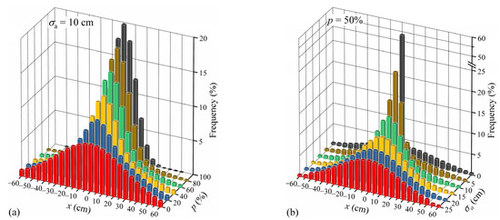 Transverse distribution frequency of the mixed traffic flow: (a) Case of σa = 10 cm; (b) Case of p = 50%.