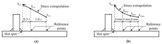 The linear extrapolation path is illustrated in Figure 9a and the hot spot stress (Shot) can be calculated as [29]: