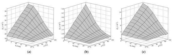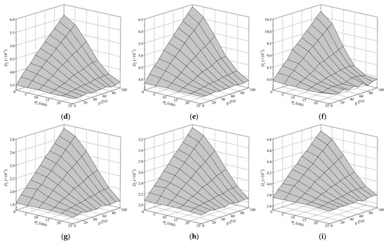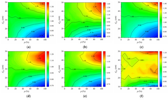 As plotted in Figure 10, De of each fatigue detail in OSDs remains constant when there are no autonomous vehicles in the traffic flow, namely in the case of p = 0. Conversely, De of these fatigue details significantly increases with the decrease in σa or the increase in p due to the presence of autonomous vehicles in the traffic flow, namely in the case of p > 0. Specifically, De of most fatigue details under consideration would increase significantly if σa ≤ 15 cm and p ≥ 30%. Compared to the case of p = 0, De of most fatigue details will increase by 51% to 210% in the extreme case of σa = 0 and p = 100%. The results indicate that the fatigue life of OSDs can be significantly affected by autonomous vehicles, especially when more autonomous vehicles are concentrated on the lane centerline. In addition, De of different fatigue details in OSDs changes to different extents under the same scenario. In particular, De of the fatigue detail D6 in COSD is 7.91 × 10−7 when p = 0, while it reaches 9.82 × 10−7 with an increase of 24% when σa = 5 cm and p = 100%. However, De of the fatigue detail D2 in COSD increases from 1.53 × 10−7 to 3.86 × 10−7 under the same case, and the increase in De. reaches 152%. Comparing the results of fatigue details D4, D5, and D6 in the COSD and the LWCD, it can be found that De of each fatigue detail in the LWCD is much less than that of the COSD, which demonstrates that the LWCD has better fatigue performance than the COSD. Nevertheless, the fatigue damage of fatigue details in the LWCD is still significantly affected by autonomous vehicles, which is just slighter than that of the COSD under the same scenario.