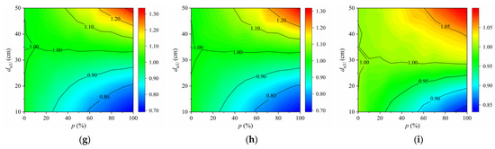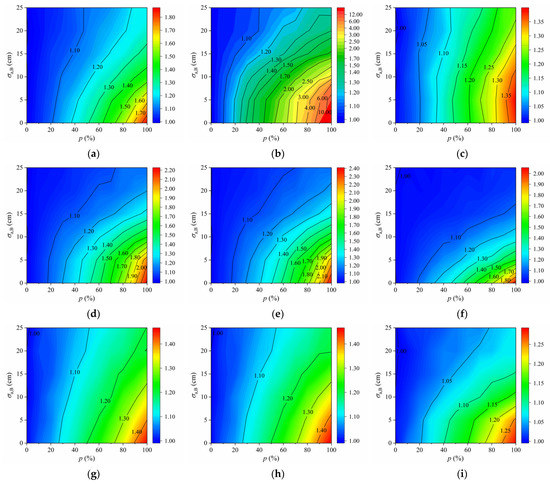 Ym/Yh of fatigue details under the scenario of Pattern 1: (a) D1 in COSD; (b) D2 in COSD; (c) D3 in COSD; (d) D4 in COSD; (e) D5 in COSD; (f) D6 in COSD; (g) D4 in LWCD; (h) D5 in LWCD; (i) D6 in LWCD.