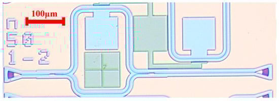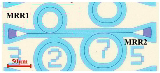 Mach–Zehnder Interferometers (MZIs), one of the most widely used structures, have been demonstrated in a wide range of applications, including wavelength division multiplexers [34,35], optical switches [36], electro-optical modulators [37] and biosensors [38,39]. In this paper, we also propose AMZI temperature sensors based on the p-Si platform. The microscopic image of AMZI is shown in Figure 4. It consists of two 3 dB couplers and two arms with different lengths. Directional coupler (DC), Y-branch splitter, and multi-mode interferences (MMI) are common structures for 3 dB couplers. Considering with the bandwidth and process tolerance, we choose MMI as 3 dB couplers for the AMZI sensors.