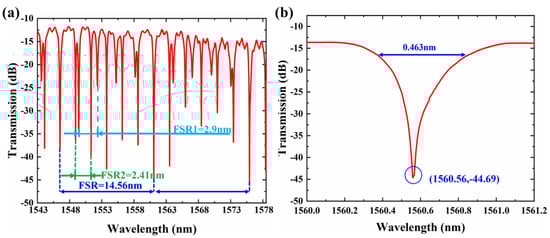 Our dual-MRR sensor consists of a ring (MRR1) and a racetrack (MRR2) resonator. The gap between the ring and bus waveguide is 300 nm. The racetrack resonator consists of a directional coupling (DC) coupling region. For the coupling region, the gap and the length are 400 nm and 10 μm, respectively. The radii of the ring and racetrack are 30 μm and 40 μm, respectively. A broadband tunable laser system (Santec Full-band TSL-550) covering the ultra-wide tuning range of 1260 nm to 1630 nm was used to characterize the fabricated devices. The resolution is 1 pm for MRR, narrow linewidth components, in the measurements. This system combines up to three tunable lasers (TSL-550) with an optical switch module (OSA-110). The light from output grating is measured through an optical power meter (MPM-210H). The light from laser and devices is coupled into the devices through a vertical fiber coupling system with a polarization controller. The minimum loss of the reference grating is ~10.42 dB for the fundamental transverse electric (TE) mode. The spectrum of the dual-MRR sensor from 1543 nm to 1568 nm at 25 °C is shown in Figure 2a. The on-chip insertion loss is ~1.46 dB. Two group resonances with different FSRs are observed. The FSRs for different MRRs are FSR1 = 2.9 nm and FSR2 = 2.41 nm, respectively. We observe the resonance dips at 1546.00 nm and 1578 nm. The FSR for our dual-MRR is about 14.56 nm. Figure 2b shows the transmission of the resonator peak at 1560.56 nm. The full width at half maximum (FWHM) of the resonance peak for the present resonator is about Δλ = 463 pm at 1560.56 nm, indicating a loaded Q factor Qload = λ/Δλ of 3370.
