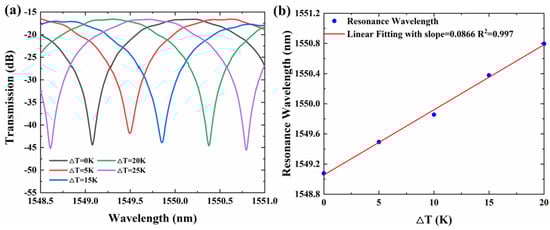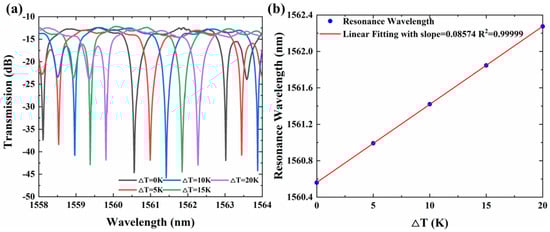 The temperature response of the sensor was investigated by placing it on a high-precision temperature console stage with a temperature resolution of 0.1 K. Figure 3a shows the measured spectra of the dual-MRR temperature sensor, indicating a linear wavelength shift with temperature from 0 K to 20 K. The resonant wavelength is extracted and linearly fitted as shown in Figure 3b. The slope of fitting results presents the temperature sensitivity, which is calculated as Δλ/ΔT = 85.74 pm/K with a correlation coefficient (R2) of 0.99996.