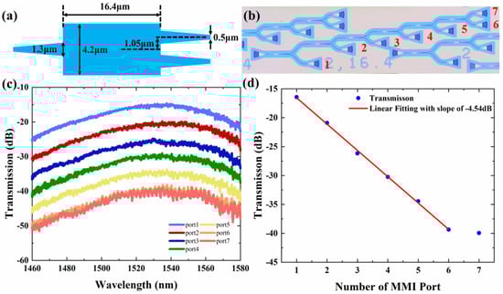 The 1 × 2 MMI used in the sensor is shown in Figure 5a. A series of cascaded MMIs were fabricated to characterize the insertion loss and uniformity of the output waveguides, as shown in Figure 5b. Transmission spectra from ports 1–7 in the range of 1460 nm to 1580 nm are shown in Figure 5c. Then, we fit the transmission loss at 1550 nm and found the slope of the linear fitting was −4.45, as shown in Figure 5d. It means the excess loss of MMI is 1.54 dB. The MMI shows superior uniformity according to the transmission spectra of ports 6 and 7.