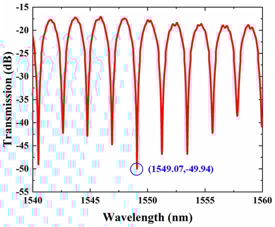 The same characterization system with a dual-MRR sensor is applied for the AMZI. The transmission spectrum of our designed AMZI sensor is shown in Figure 6 when the temperature is 25 °C. The AMZI shows an insertion of 16.5 dB. The FSR of AMZI is 2.06 nm, which is consistent with the calculated result.
