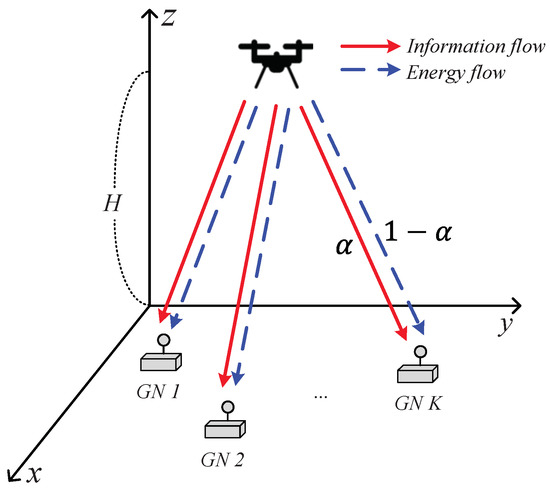 As shown in Figure 1, we consider a UAV-assisted SWIPT system, in which a single UAV transmits information and power through the same signal to K GNs. Let T denote the UAV flight period, which is discretized into N equal-length time slots, , and assume the location of the UAV to be unchanged within each time slot. We also denote H and V as the fixed altitude and maximum flying speed of the UAV; then, the maximum flying distance becomes in each time slot. The fixed horizontal coordinate of the GN k is given by , and the horizontal coordinate of the UAV at each time slot is expressed as . Moreover, the UAV must periodically return to its starting position after one period to support the GNs. Then, the mobility constraints of the UAV are given by