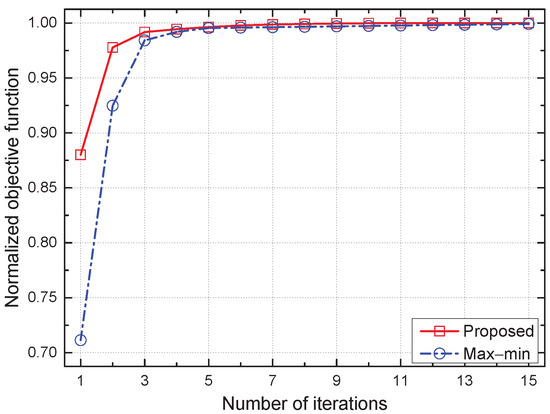 Figure 2 compares the convergence performance between the proposed and max–min schemes, where the objective function normalized to the convergence point is plotted on the y-axis because both schemes have different objectives, e.g., the sum of the logarithmic average SE of the GNs for the proposed scheme, while the minimum average SE among all GNs for the max–min scheme. Both schemes converge to the stationary point within 15 iterations; however, the proposed scheme has less variation and converges faster than the max–min scheme, which verifies the convergence stability of the proposed iterative algorithm.