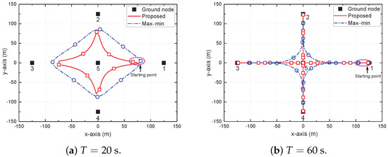 Figure 3 shows the trajectory of the UAV for different T, e.g., s and s. The circular and square markers represent the positions of the UAV sampled every 2.5 s. When T is small, the UAV flies close to its maximum speed V to get as close to each GN as possible for building shorter LoS links within each limited time period. Moreover, as T increases, the UAV adjusts its trajectory to move closer to the GNs. Through this trajectory, the UAV can efficiently support all GNs. Compared to the max–min scheme, the trajectory of the proposed scheme is narrow and the UAV goes directly through the central GN. This is because the two schemes have different objectives. The max–min scheme should support all GNs as equally as possible to maximize the minimum average achievable SE; therefore, it should not go directly through the central GN, which is likely to receive the maximum service. However, to maximize the sum of the logarithmic average SE of the GNs, it is important to increase the SE of each GN, as well as to ensure the fairness of the GNs. Therefore, it allows the SE of the central GN to be greater than those of the other GNs to some extent so that the UAV visits all GNs directly.