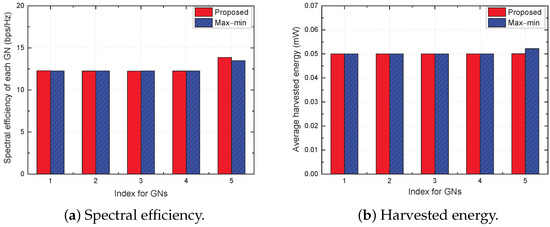 Figure 4 shows the SE and harvested energy of each GN when for the proposed and max–min schemes. The proposed scheme guarantees the average harvested energy requirement tightly, but provides a higher SE for GN 5 compared with the other GNs. On the other hand, the max–min scheme supports GN 5 with a relatively low SE compared to the proposed scheme, but ensures higher harvested energy for GN 5. The reason for this aspect is that, as explained above, the objectives of the two schemes are different.