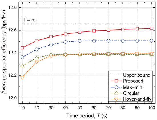 Figure 5 shows the average SE versus the time period T for all considered schemes. The average SE of all schemes increases with T and eventually saturates when T is large enough. In particular, the performance gap between the proposed scheme and its upper bound with decreases as T increases. A larger T allows the UAV to fly for a longer time, making it easier for the UAV to get closer to the GNs for service. Accordingly, the average SE can be improved. However, the average SE of the circular and hover-and-fly schemes, which have a fixed trajectory, saturates earlier at a small T, and the performance improvement achievable by increasing T is also small. Furthermore, the proposed scheme outperforms the conventional baseline schemes, and the performance gap increases with T. In particular, the proposed scheme can serve the GNs with higher SE while providing a level of user fairness similar to that of the max–min scheme.