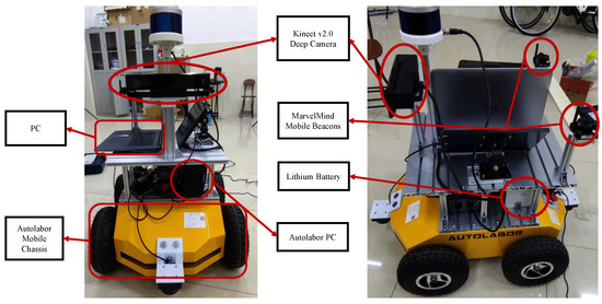 Since the algorithm in this paper requires the placement of dual MarvelMind tags and also requires the mobile robot chassis to be equipped with a PC and connected with a network cable for distributed communication. Based on this need, the original AUTOLABOR mobile robot was modified to suit the experimental requirements of this paper. The modified mobile robot platform is shown in Figure 7, with the addition of dual MarvelMind location tags and an additional layer for the PC to ensure distributed information transmission using a network cable.