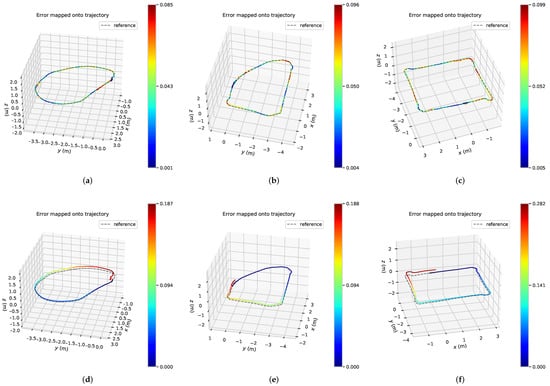 Circular trajectory error under different driving trajectories. (a) Our optimization algorithm (Trajectory 1); (b) Our optimization algorithm (Trajectory 2); (c) Our optimization algorithm (Trajectory 3); (d) ORB_SLAM2 back-end algorithm (Trajectory 1); (e) ORB_SLAM2 back-end algorithm (Trajectory 2); (f) ORB_SLAM2 back-end algorithm (Trajectory 3).