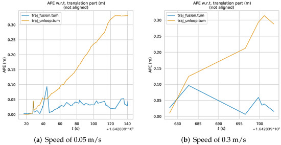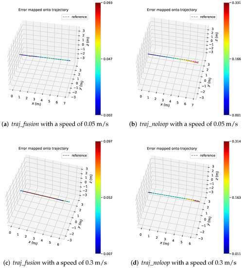 Calculating the trajectory error can get the results shown in Figure 11, which reflects the trajectory error of two sets of straight-line data, where the speed is 0.05 m/s in Figure 11a,b, and 0.3 m/s in Figure 11c,d. Figure 11a,c show the trajectory traj_fusion of fusion IPS, and Figure 11b,d shows the traditional back-end optimized trajectory traj_noloop. it can be seen in the figure that the traj_noloop trajectory also has the problem of cumulative drift in the straight line state, and the mobile robot runs in the x-axis and drifts in the y-axis. While traj_fusion trajectory results from the graph does not have a larger degree of positional drift.