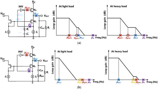 FVF-based LDOs achieve a good transient response within a short edge time compared with traditional resistor-based LDO regulators. However, the stability of the system is dependent on a large on-chip capacitor or ESR capacitance. To avoid significant consumption of area, the dominant pole is designed at the gate of the NMOS within a wide range of load capacitances in the proposed FVA topology. Moreover, the FVA-based LDO adopting the output pole as the dominant pole exhibits superior performance at ESR conditions. The LDO structure and its poles are sketched in Figure 4 under different conditions. Due to the small CG and low output impedance of the NMOS FET, two poles pout and pgate are pushed to high frequencies, as depicted in Figure 4a. Without frequency compensation, the system may face stability problems since pout is close to pgate at the light load condition. To improve the phase margin at light or no load conditions, small series resistance–capacitance (R-C) compensation was adopted at the gate of the power transistor. This helps to push the pgate to a lower frequency and generate a left-half-plane (LHP) zero zgate. As shown in Figure 4a, pgate, pout, and zgate can be given by: