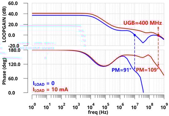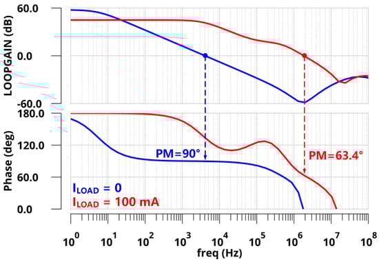 For the ESR case, a large off-chip capacitor of 1 µF with RESR = 100 mΩ was adopted for a large load current and better transient response. Figure 12 shows the Bode plots of the FVA loops at both zero and full load conditions (ILOAD = 0 µA and 100 mA). From the simulation, pout is pushed to low frequencies and becomes the dominant pole. At the zero load current condition, zESR and pgate are locked at frequencies higher than the loop UGB, resulting in a phase margin of 90°, as expected. At the full load current condition, pout shifted to higher frequencies owing to the decrease in output impedance. However, zESR could counteract the phase shift of pgate, and another internal pole pin was higher than UGB. Therefore, the phase margin at full condition is shown as 63.4°.