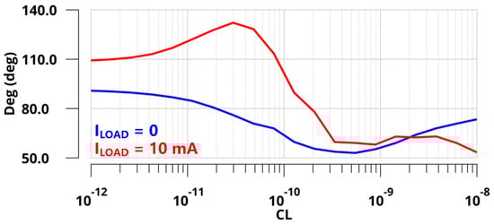 The proposed design was implemented in a standard 110 nm CMOS process. At the no off-chip capacitor condition, the FVA-based LDO delivered a maximum load current of 10 mA with a 3.3 V output voltage and 1.65 V output voltage to provide V/2 read bias for cross-point memory. Additionally, the quiescent current was 70 µA. Figure 7 shows the Bode plots of the FVA loops at both zero and full load conditions (ILOAD = 0 µA and 10 mA) with zero load capacitance (CL = 0 pF). From the simulation, the zgate introduced by R-C compensation could counteract the phase shift of the pout at both conditions. To address another internal pole pin at the heavy condition, a small resistance connected to the output capacitor was adopted to generate an LHP zero at high frequencies. As expected, the phase margins of the FVA loop were 91° and 109° under 0 µA and 10 mA loads, respectively. The UGB of the system reached approximately 400 MHz at full load, leading to fast transient responses. In addition, the pole-zero doublet introduced by the voltage-spike detection circuit in low-middle frequency increases the low-frequency gain. The stability of the system does not deteriorate. To verify the stability of the system under variable load capacitance, Figure 8 presents the phase margin of the proposed LDO with a range of CL from 0 pF to 10 nF. The simulation results indicated that the phase margin was larger than 50° at both zero and full load conditions. Therefore, for a wide range of CL, the proposed LDO is stable at light and heavy load current conditions.