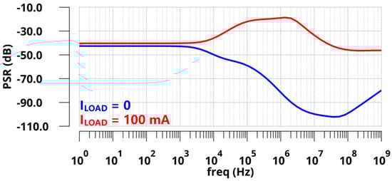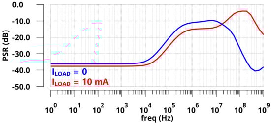 Simulated PSR of the proposed LDO with a 1 µF off-chip capacitor.