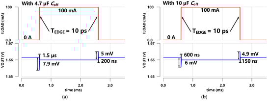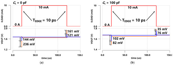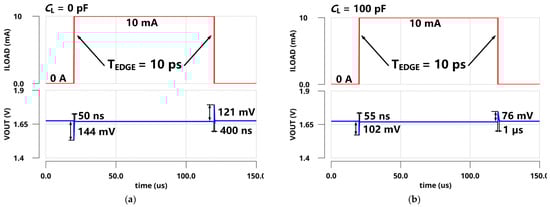 The simulated PSRs of the regulator at zero and full load conditions are presented in Figure 9. With zero CL, the simulated PSR of the proposed LDO was −17.8 dB at 1 GHz under a 10 mA load and −37.4 dB at 1 GHz under zero load. Figure 10 shows the simulated transient response of VOUT with a full current step (ILOAD changed from 0 µA to 10 mA) within an edge time of 10 ps. As shown in Figure 10a, the undershoot voltage and settling time were only 144 mV and 50 ns without CL due to the fast FVA loop. Additionally, the overshoot voltage and settling time were 121 mV and 400 ns, respectively. As shown in Figure 10b, the simulated undershoot and overshoot voltages were reduced to 102 mV and 76 mV with 100 pF CL. Furthermore, the simulation results are shown in Figure 11 under the same on-chip capacitor and quiescent current conditions compared with FVF-based LDO. By replacing the PMOS and FVF structure with NMOS and FVA topology, both the undershoot and overshoot were effectively reduced with different load capacitors. As a remark, the proposed LDO exhibits a fast transient response under various load conditions.