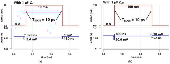 Simulated load transient responses with a 1 µF off-chip capacitor within an edge time of 10 ps for different load steps (a) ΔILoad = 10 mA; (b) ΔILoad = 100 mA.