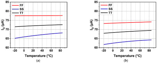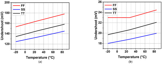 To further verify the reliability of the transient response for the circuit, the undershoot voltage from −20 °C to 85 °C at different process corners is shown in Figure 18. When the load current changed from zero load to full load, load-transient undershoots could be observed. For the no off-chip capacitor case, the minimum undershoot was 124.6 mV at −20 °C, SS process, and the maximum undershoot was 178 mV at 85 °C, FF process. For a 1.65 V output voltage, the abovementioned undershoot voltage simulation results are acceptable with a quite small settling time. In addition, the load-transient undershoot results of the regulator with off-chip capacitors are illustrated in Figure 18b. The undershoot voltage is significantly reduced, with a minimum undershoot of 18 mV at −20 °C, SS process, and a maximum undershoot of 24.4 mV at 85 °C, FF process.