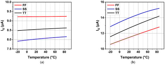 Figure 16 shows the quiescent current from −20 °C to 85 °C at different process corners and both zero and full current load conditions. Due to the high gate voltage of MP at the full load condition, the current replicated from the current mirror to the inverting amplifier is slightly reduced. It is obvious that there was a decrease in quiescent current at full load compared to the zero load condition. It reduced the loop gain at low frequencies slightly but did not deteriorate the circuit stability. Similarly, the quiescent current characteristics of the regulator with off-chip capacitors are illustrated in Figure 17. Due to the introduction of Coff, good transient characteristics can be realized without consuming a high current for a high UGB. As a result, the current efficiency is significantly improved. In addition, adaptive bias was adopted to improve the stability and load regulation of the system. Under a light current load, the adaptive bias consumes an ultra-low quiescent current. Meanwhile, under full current load, the increased current consumption is completely acceptable, as shown in Figure 17b.