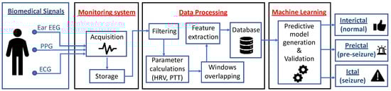 Due to the high impact epileptic seizures have on the quality of life of the people who suffer them, customizable technologies and intelligent systems based on biomedical signals specifically designed for seizure detection have been developed [3,4]. However, they still need to improve their reliability and predictive capacity. Some of the most commonly involved biomedical signals for monitoring an epileptic patient with these devices are Electroencephalogram (EEG), Electrocardiogram (ECG) and Photoplethysmography (PPG).